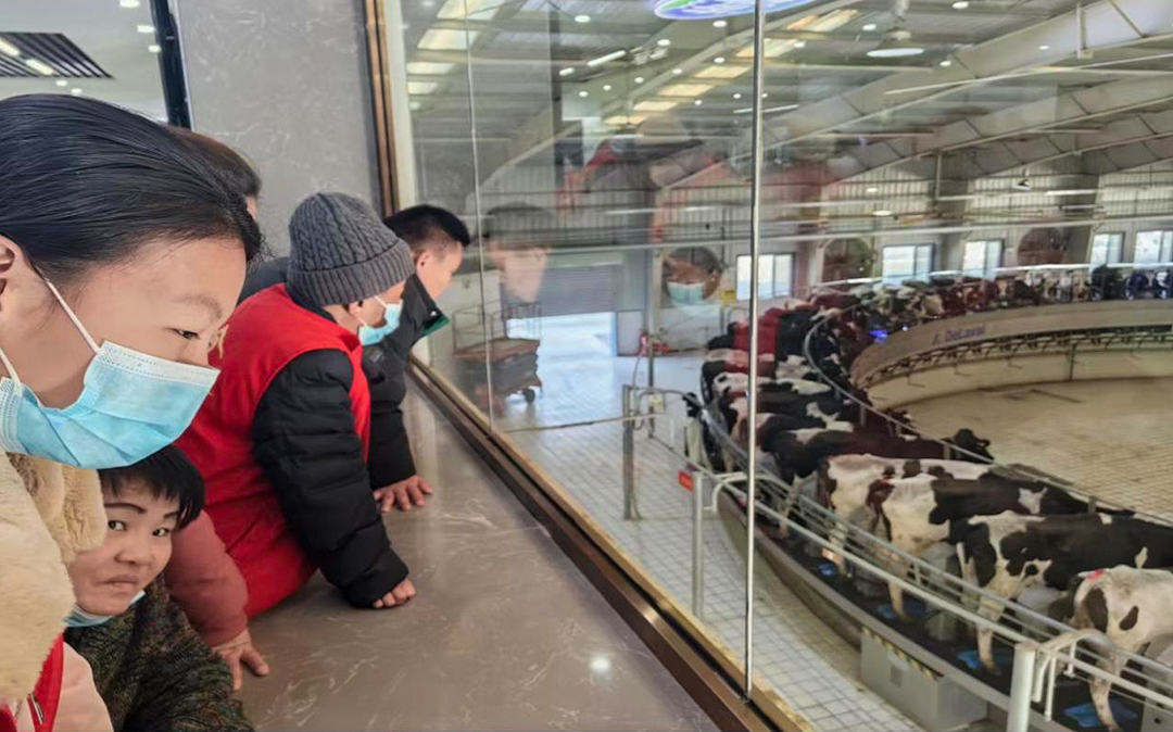 在祁牧乳业奶牛场,活泼好动的小奶牛瞬间吸引了大家的目光。服务对象们隔着围栏与小牛亲切互动,脸上洋溢着欣喜的笑容。现代化的采奶设备和自动化生产线展示了科技赋能农业的最新成果,成排的奶牛与高效的生产场景构成了一幅壮观的画面,大家纷纷用手机记录下这难忘的瞬间。