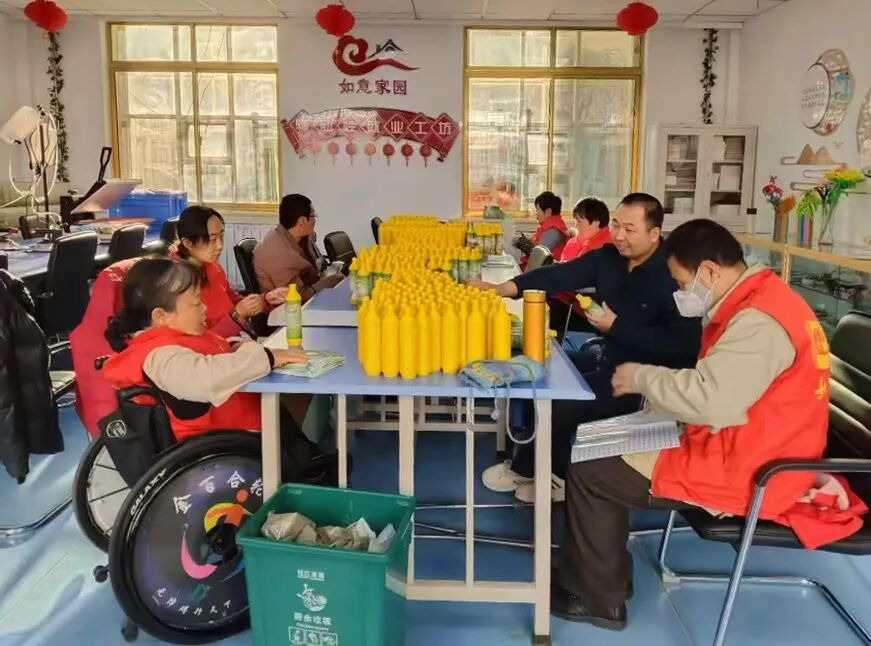 新春将至,万物迎新。工坊里也洋溢着温暖而充满干劲的气氛,大家正用踏实劳动迎接又一个充满希望的春天。这里,“照料+就业+赋能”不是一句口号,而是一个实实在在的运营核心。工坊精准对接市场需求,联动政企资源,打造了一个集技能培训、岗位适配、实操就业于一体的平台。引进灯笼流水线制作项目,承接大友嘉慈防护科技有限责任公司劳保手套、鞋垫初加工及“璐嘉”洗手液标签粘贴订单,与嘉峪关关下文化旅游公司合作,结合本地文旅特色开启文创包制作、手工编织、钩织及银雕加工等项目,承接嘉峪关市永顺豆类蔬菜农民专业合作社的干菜分拣业务……丰富的项目为不同能力的残疾人提供了多样化的选择。